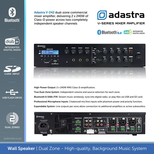 View full detailsDETAILS This Adastra V-242 dual-zone wall speaker system is ideal for pubs, restaurants, cafés and outdoor areas requiring flexible, high-quality a...