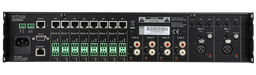 This unit includes two balanced microphone inputs with priority functions, phantom power, and three-band EQ—ideal for announcements or paging. Four stereo line inputs allow connection of music sources such as media players, tuners, or streaming devices, while eight wall-panel inputs offer additional flexibility for local zone control.