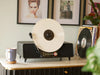 - Vertical Loading Design: Unique upright record player design with magnetic central vinyl clip to secure 12" and 7" vinyl records — a stylish space-saving alternative to a traditional turntable.