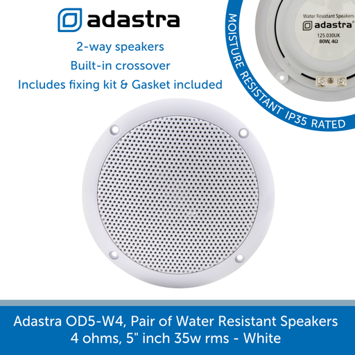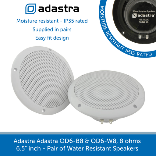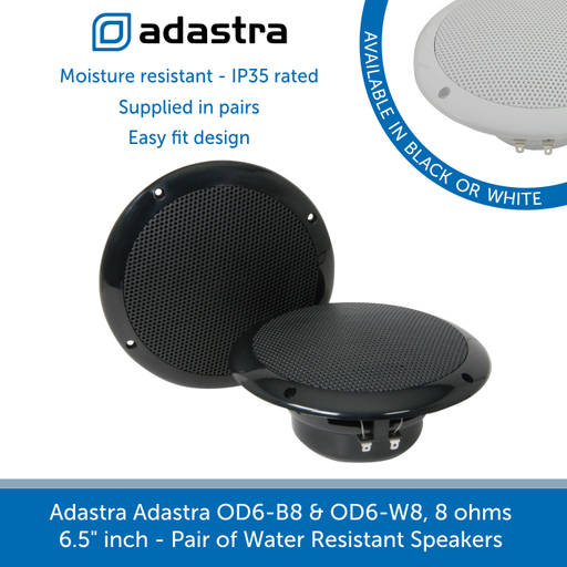 Original price £32.00 (inc. VAT) - Original price £32.00 (inc. VAT)Original price £32.00 (inc. VAT)£32.00 (inc. VAT)£32.00 (inc. VAT) - £32.00 (inc. VAT)Current price £32.00 (inc. VAT)| /In stockDETAILS Adastra OD6-B8 & OD6-W8, 8 ohms, 6.5" inch - Pair of Water Resistant Speakers that are IP35 Rated and are available in Black or White. ...