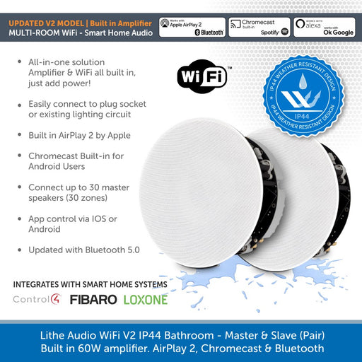 Lithe Audio WiFi V2 | Multi Room IP44 Bathroom Ceiling Speakers (Pair) - Master & Slave (AirPlay 2, Chromecast & Bluetooth)