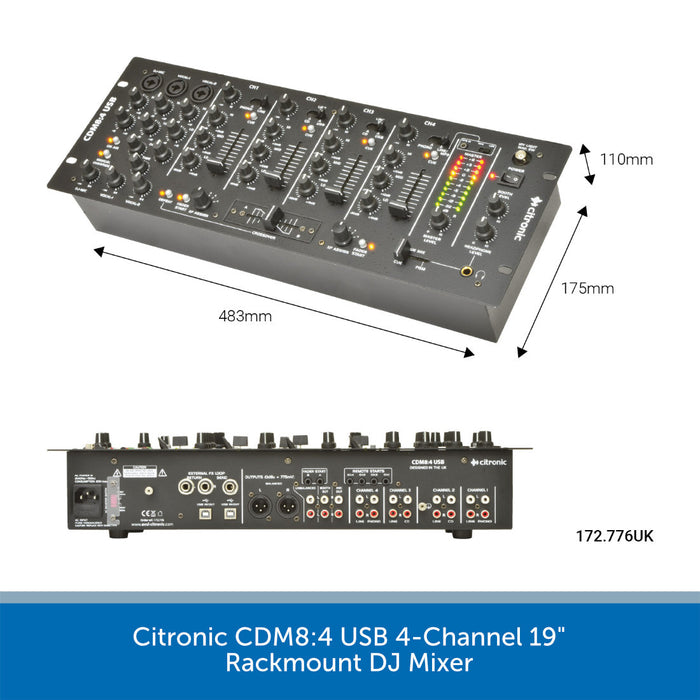 Looking for a reliable, versatile, and easy-to-use DJ mixer that can handle all your mixing needs? Look no further than the Citronic CDM8:4 USB 4-channel rack mount DJ mixer!
