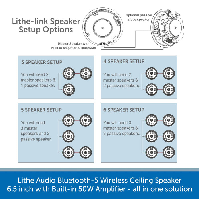 The Lithe Audio Master Bluetooth ceiling speaker is able to connect to and power an additional passive speaker via the speaker output (+/-). Simply select ‘Pair of Speakers’ when placing your order in the sales cart.
