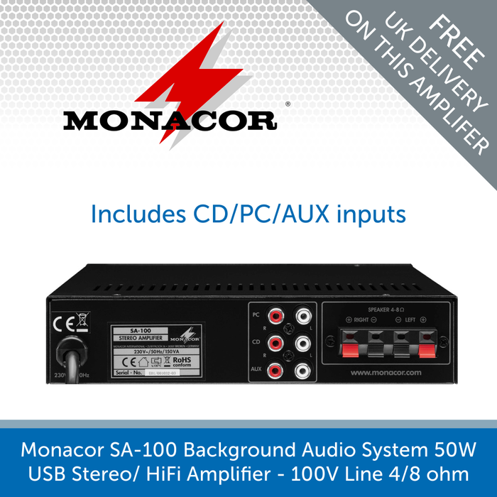 Monacor SA-100 Stereo / Hi-Fi Amplifier with USB - 50W, 4-8 Ohm Operation