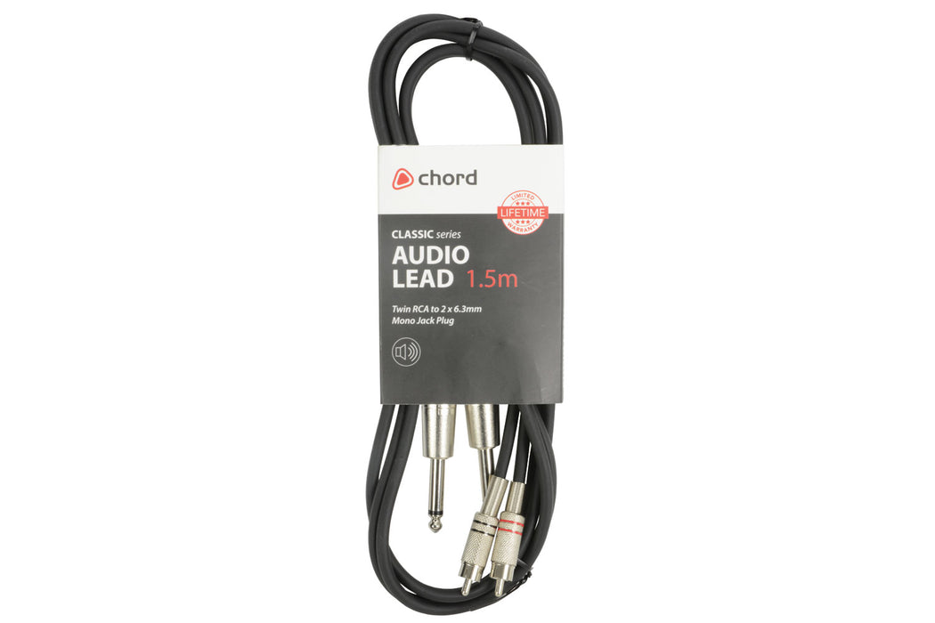 A durable, high-quality, shielded audio lead with pro quality, die-cast 6.35mm Jack Plugs and RCA Phono connectors, offering exceptional sound and reliability when taking an audio signal from an amplifier, mixer, etc.